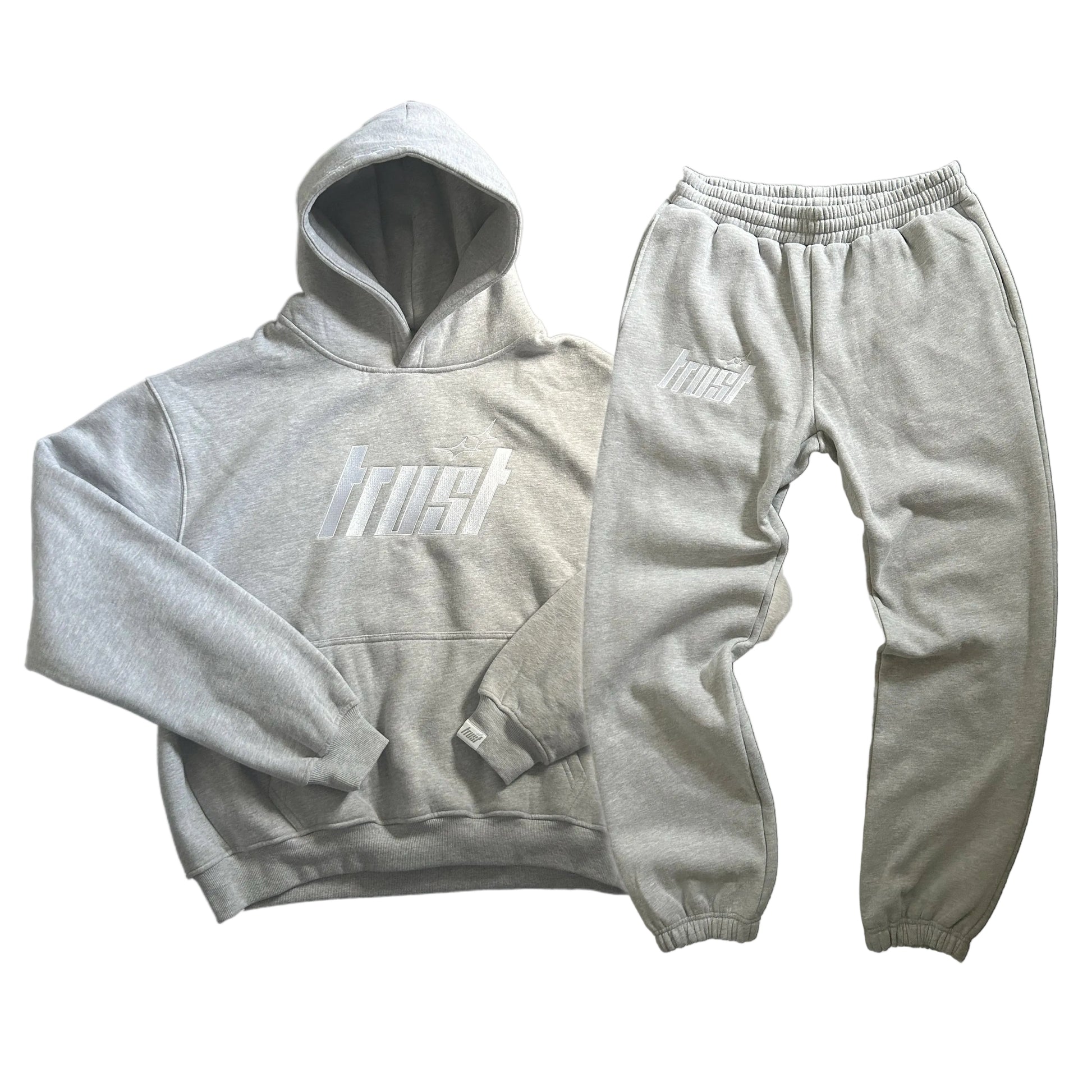 Embroidered TRUST logo, oversized, heavyweight, and built for everyday wear. Made from 320 GSM fabric with a slight dropped shoulder and cuffed joggers for that clean, relaxed fit. Adjustable inner waistband for comfort, with the go to grey and white colour way